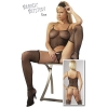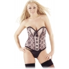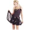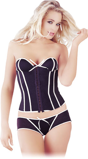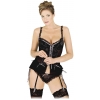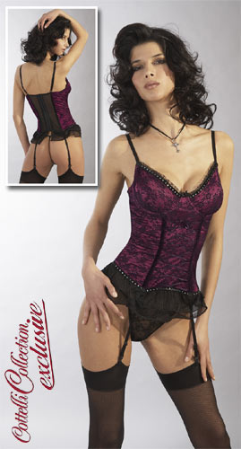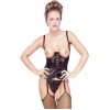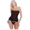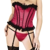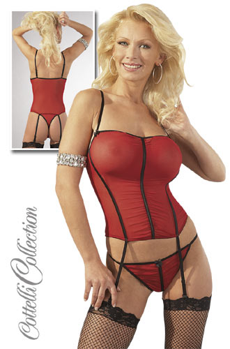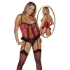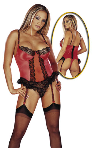 Red Satin with black lace and frill trimmings. Corsage with matching lace thong and adjustable trimmed straps and suspenders. Underwired cups, forming seams and rear double hook-and-eye closure offer a perfect fit. Comes with black mesh stockings