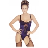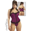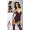 A combination of black lace with plum-coloured satin underneath. Trimmed with soft frills and rhinestone details. Basque with underwired cups and hook-and-loop closure in the back. With matching thong.