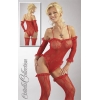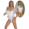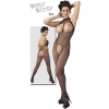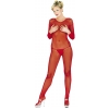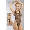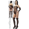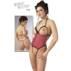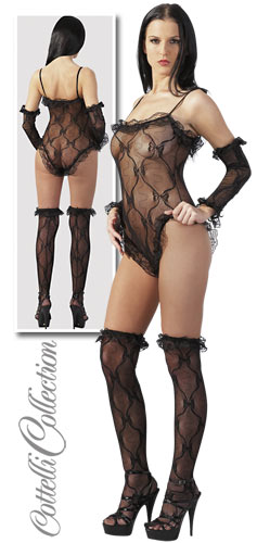 Attractive cupless body with open crotch. The front consists of transparent pink sheer mesh with black lace edgings, in the back with black lace straps. One size fits 8-14
