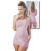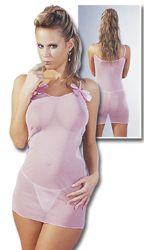 Exciting pink transparent sheer mesh dress with lace-decorated straps. Comes with matching thong.