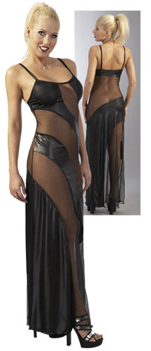 Sexy party dress for daring women! Long dress with a mix of see-through mesh and soft satin. With spaghetti straps.