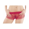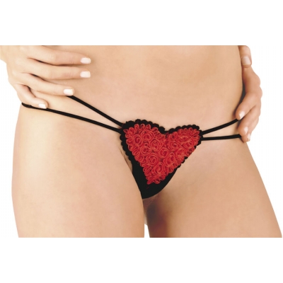 Skimpy red lace panties presented as a rose head in a clear heart shaped box